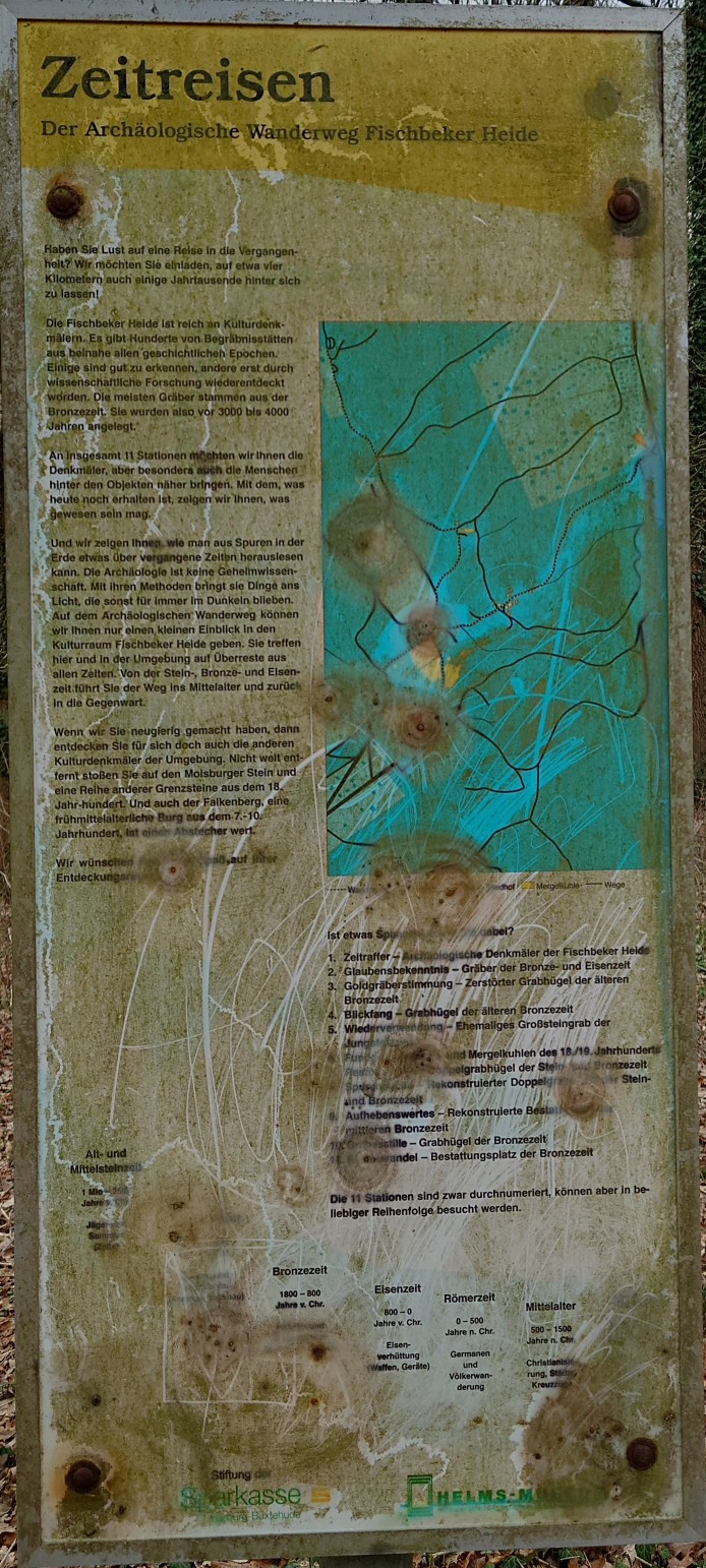 Und wir zeigen Ihnen, wie man aus Spuren in der Erde etwas über vergangene Zeiten herauslesen kann. Die Archäologie ist keine Geheimwissenschaft. Mit ihren Methoden bringt sie Dinge ans Licht, die sonst für immer im Dunkeln blieben. Auf dem Archäologischen Wanderweg können wir Ihnen nur einen kleinen Einblick in den Kulturraum Fischbeker Heide geben. Sie treffen hier und in der Umgebung auf Überreste aus allen Zeiten. Von der Stein-, Bronze- und Eisenzeit führt Sie der Weg ins Mittelalter und zurück in die Gegenwart.