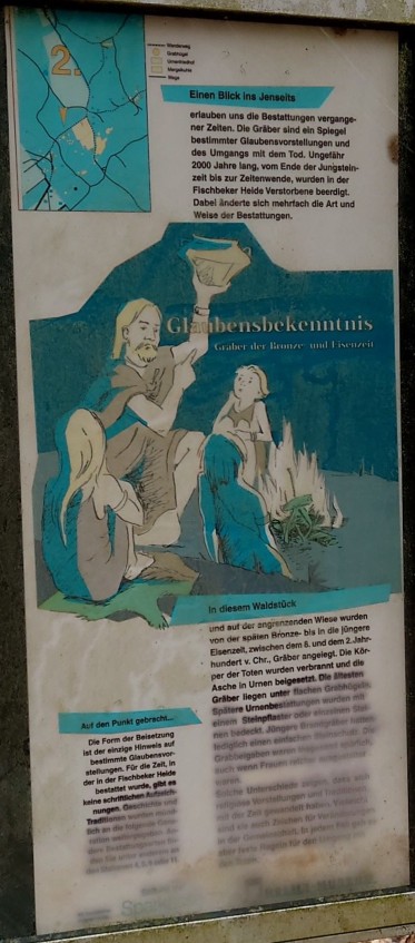 Die Form der Beisetzung ist der einzige Hinweis auf bestimmte Glaubensvorstellungen. Für die Zeit, in der in der Fischbeker Heide bestattet, wurde, gibt es keine schriftlichen Auszeichnungen. Geschichte und Traditionen wurden mündlich an die folgende Generation weitergegeben. Andere Bestattungsarten finden Sie unter anderem an den Stationen 4, 5, 9 oder 11.