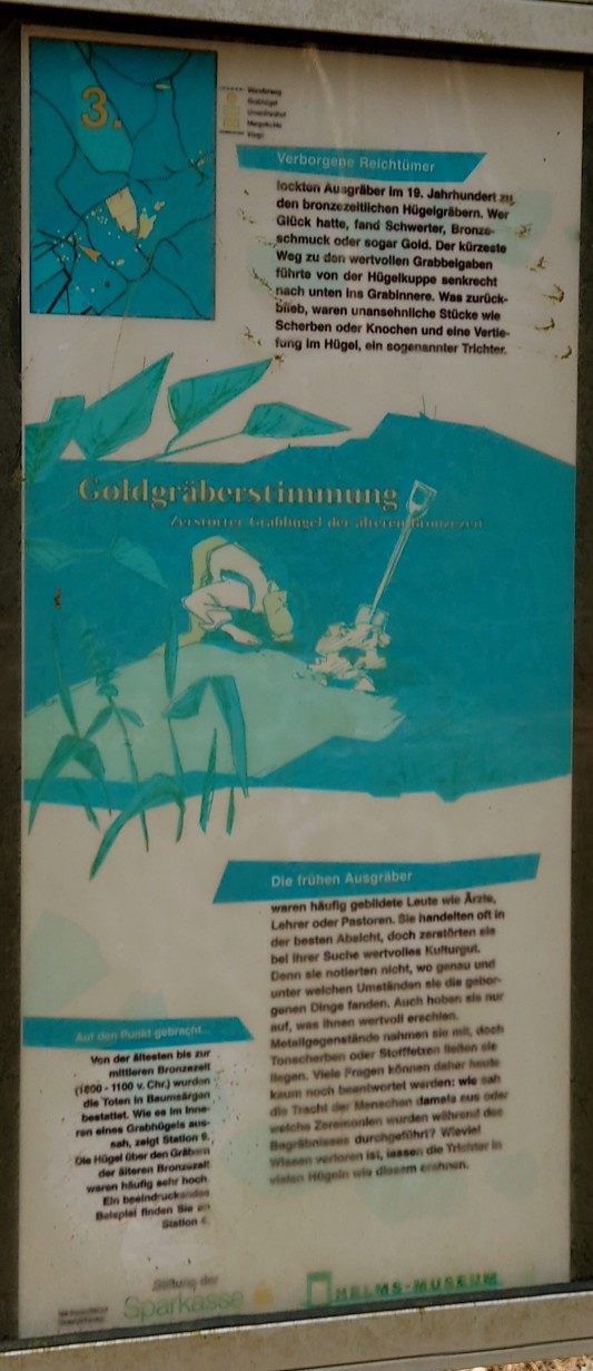 Metallgegenstände nahmen sie mit, doch Tonscherben oder Stofffetzen ließen sie liegen. Viele Fragen können daher heute kaum noch beantwortet werden: wie sah die Tracht der Menschen damals aus oder welche Zeremonien wurden während des Begräbnisses durchgeführt? Wieviel Wissen verloren ist, lassen die Trichter in vielen Hügeln wie diesem erahnen."