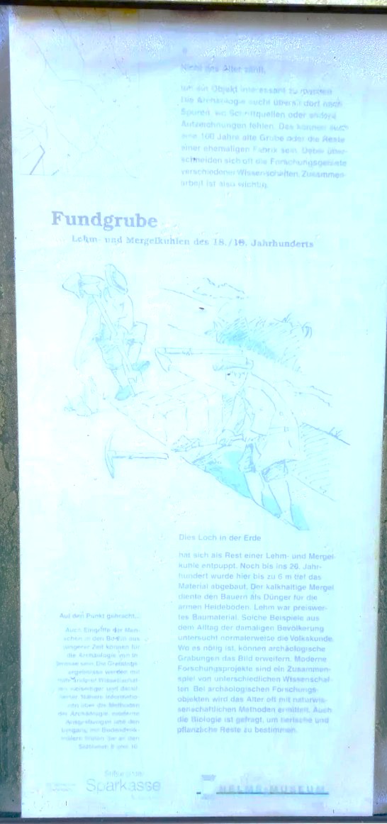 hat sich als Rest einer Lehm- und Mergekuhle entpuppt. Noch bis ins 20. Jahr-hundert wurde hier bis zu 6 m tief das Material abgebaut. Der kalkhaltige Mergel diente den Bauern als Dünger für die armen Heideboden. Lehm war preiswertes Baumaterial. Solche Beispiele aus dem Alltag der damaligen Bevölkerung untersucht normalerweise die Volkskunde Wo es nötig ist, können archäologische Grabungen das Bild erweitern. Moderne Forschungsprojekte sind ein Zusammen spiel von unterschiedlichen Wissenschaften Bei archäologischen Forschungsobjekten wird das Alter oft mit naturwissenschaftlichen Methoden ermittelt Auch die Biologie ist gefragt, um tierische und pflanzliche Reste zu bestimmen."