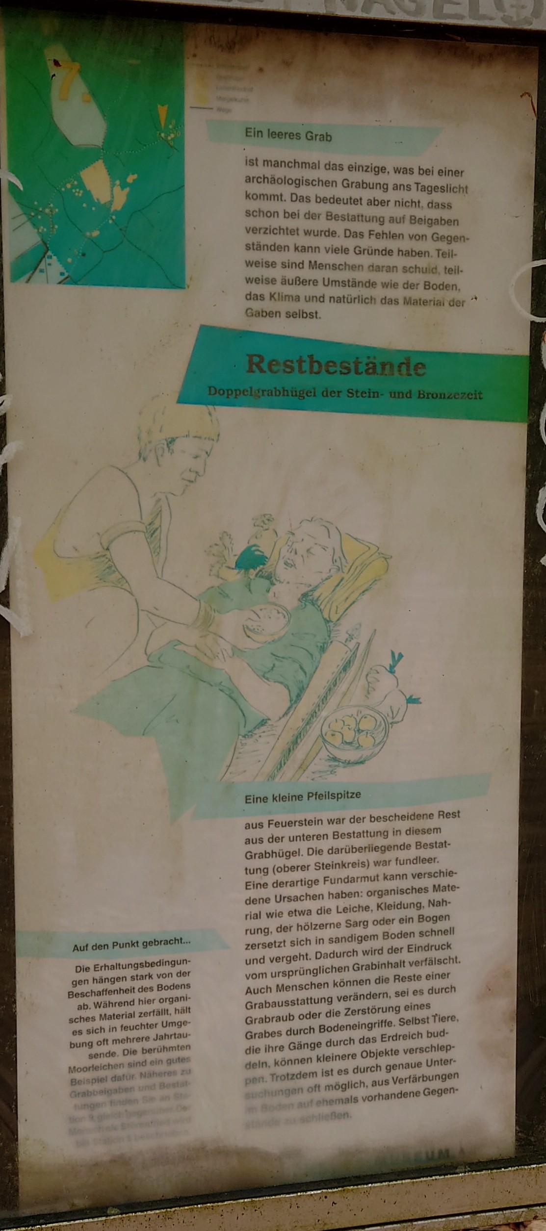 Die Erhaltungsbedingungen hängen stark von der Beschaffenheit des Bodens ab. Während hier organisches Material zerfällt, hält es sich in feuchter Umgebung oft mehrere Jahrtausende. Die berühmten Moorleichen sind ein gutes Beispiel dafür. Näheres zu Grabbeigaben und Bestattungen finden Sie an Station 9 gleich gegenüber. Der Mensch als Störenfried wird bei Station 3 beschrieben.