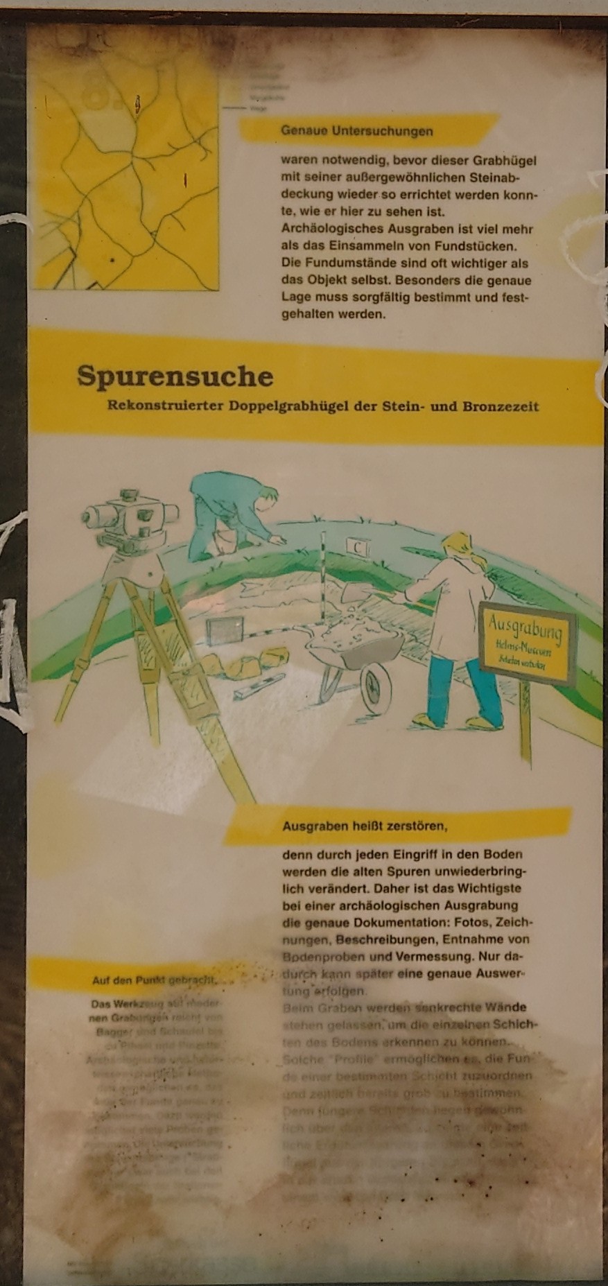 denn durch jeden Eingriff in den Boden werden die alten Spuren unwiederbringlich, verändert. Daher ist das Wichtigste bei einer archäologischen Ausgrabung die genaue Dokumentation: Fotos, Zeichnungen, Beschreibungen, Entnahme von Bodenproben und Vermessung. Nur da-durch kann später eine genaue Auswertung erfolgen.