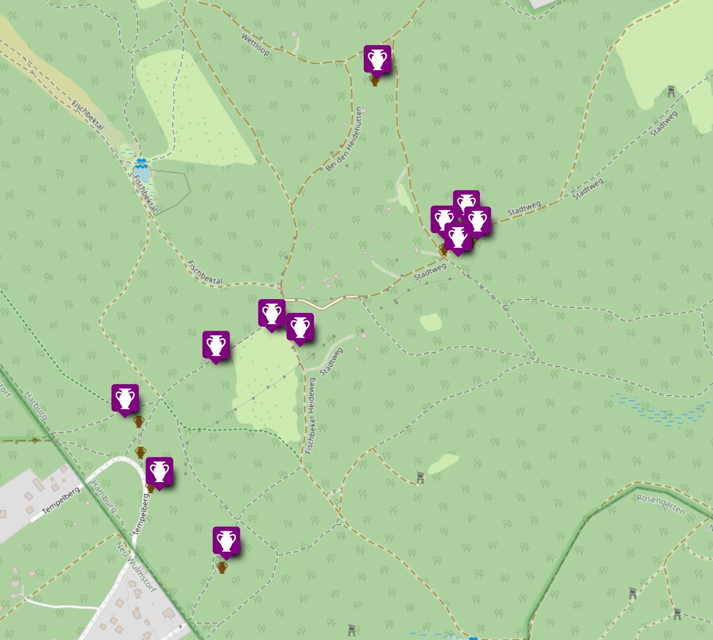 => Karte Archäologischer Wanderpfad Fischbeker Heide mit den 11 Stationen